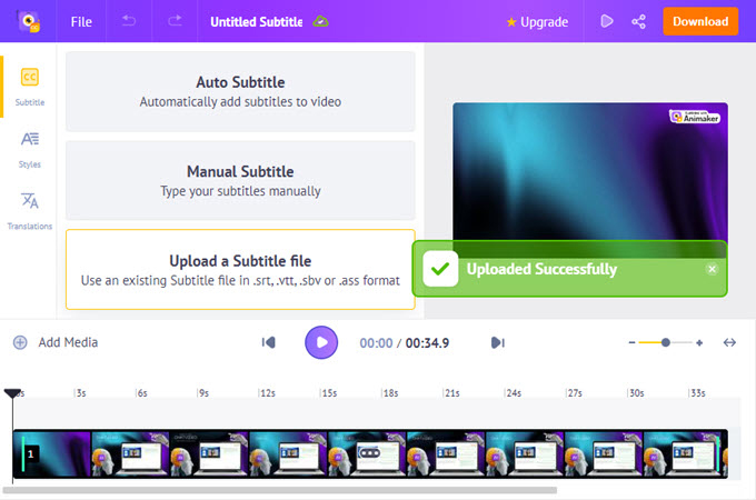 Animaker is another AI-powered online video editing program on the internet that enables users to generate subtitles for their videos. It offers two options for adding subtitles to your videos: you can either add them automatically or type them manually. Additionally, Animaker allows you to download the added subtitles in formats such as .srt, .vtt, .sbv, or .ass. Furthermore, this program supports the upload of video files in various formats, including MP4, MOV, AVI, FLV, and WEBM. Meanwhile, you can utilize its collaboration feature to auto add subtitles to video with your colleagues simultaneously.