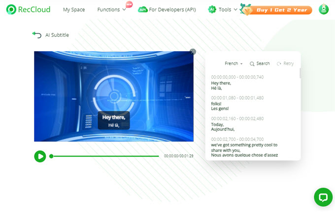 RecCloud is the first tool you can rely on if you’re looking for an online program that allows you to add subtitles to your content. Not to mention, this program has a straightforward interface and advanced AI technology that you can use to insert subtitles into your video with ease. With the help of its AI technology, you just need to upload the content and select your preferred language to successfully finish the process. What’s more, this program enables you to insert two languages as your subtitles by using its Bilingual feature. Meanwhile, this program lets you add subtitles to video without watermark with the most popular web browsers nowadays, including Chrome, Safari, and Firefox.