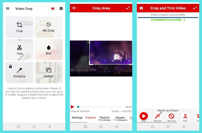 If you are using an Android device, you can install Crop & Trim Video. This video logo remover app is simple and easy to use. You can use either crop and blur features to remove the logo from your video without any difficulty. Follow the steps below to learn how you can remove the logo from video using this useful app.