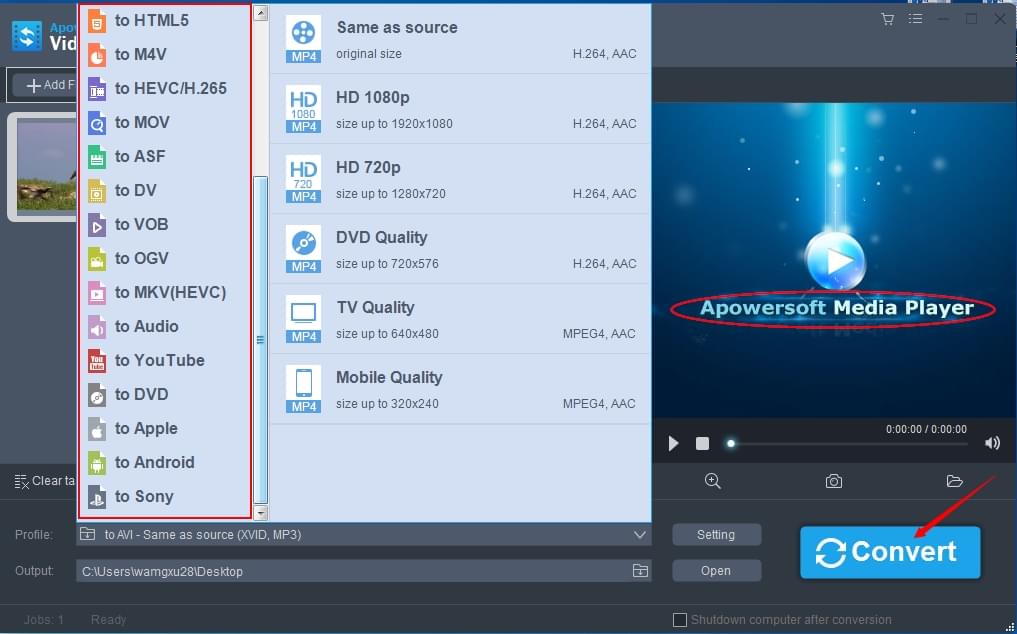 Even much better, this utility has a built-in player where you can instantly play the converted file. And it allows you to convert all files in batch and merge them to one file. Except those multiple video and audio formats, this program also provides some optimized output presets for you to convert videos directly for Apple, Android, Sony, etc. However, since it is a desktop software, it requires downloading and installation before using it. And it takes longer time with regards to converting multiple files at the same time. Anyway, it is indeed a great AVI to iTunes converter which is of good value to try.