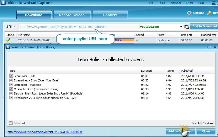 Step 1: To begin with, enter the YouTube playlist page and bring the playlist URL to download bar on Video Download Capture, select “Add to download” button. Then, a window which list the videos in playlist will appear, you can choose the desired videos by ticking the boxes beside the video name. Tap “Add to Download” again.