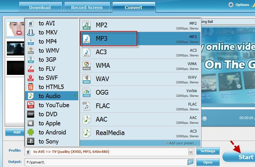 Step 3: The converter interface is show up, click “Profile” bar and set the target format as “to Audio” – MP3. Press “Start” icon, the converter will convert playlist to MP3 files at high speed.
