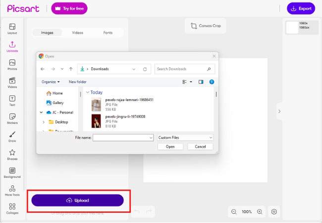 - Open Picsart on your PC and upload your image.