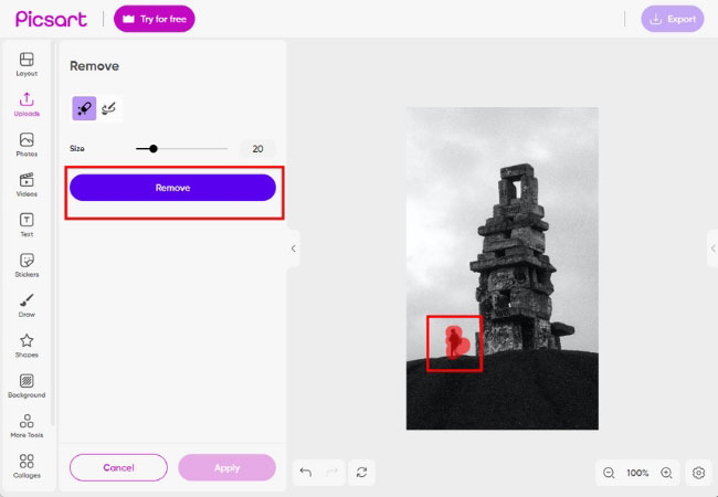 - Use the brush to highlight the object you want to remove. click “Remove” to erase the highlighted object.