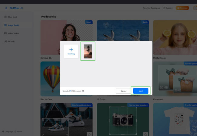- Upload the picture by clicking Start.