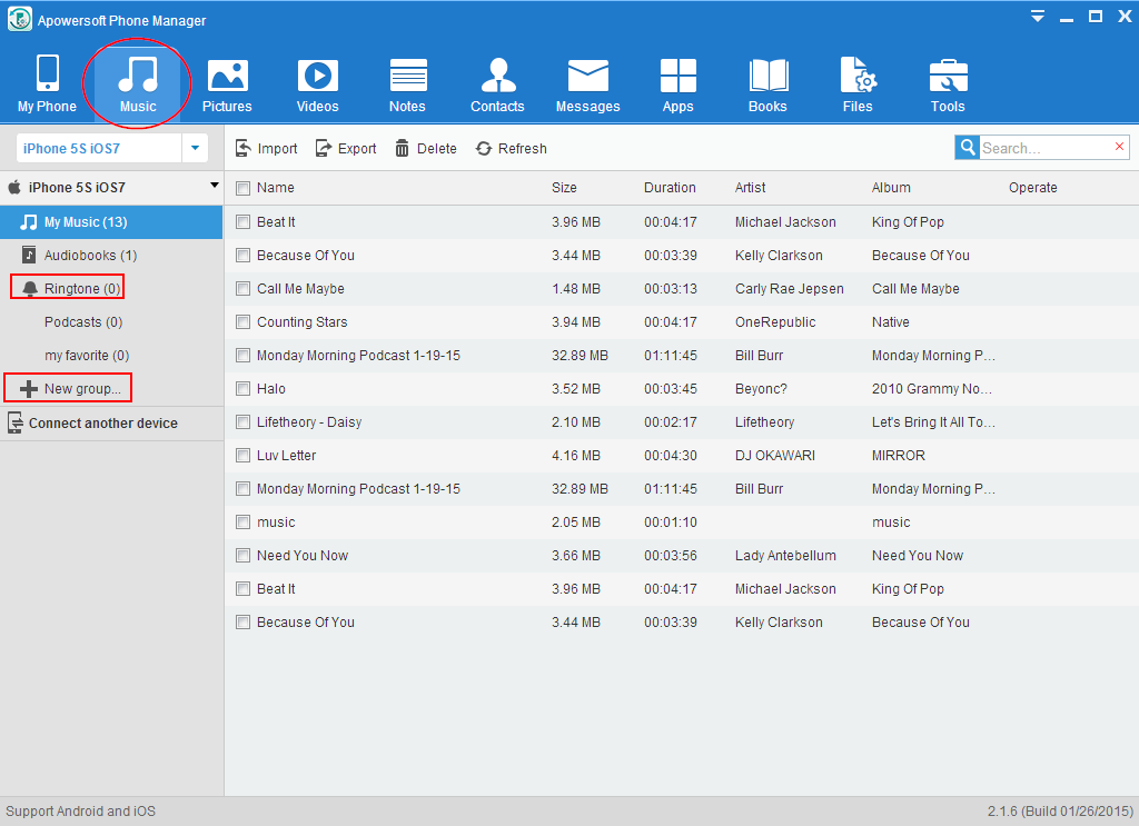 This phone manager is perfectly compatible with Android and iOS smartphones. If the wanted music is stored on other iDevices or Android smartphones, you can quickly transfer music between two devices, because this phone manager could simultaneously connect two phones and manage to transfer data between phone and computer.