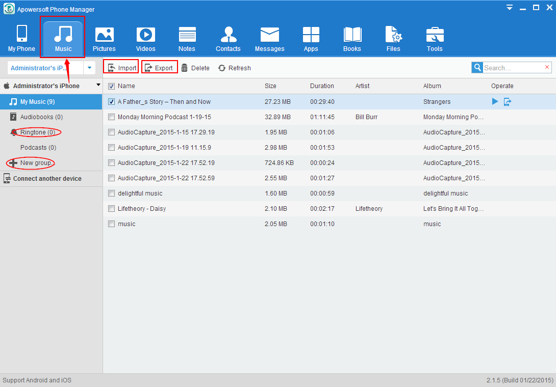 - After entering the interface, click “Music” icon on the top. Under music menu, you will see all existing iPhone music. You can import downloaded music from PC or other devices to iPhone, export iPhone music to computer, iPhone or Android smartphones. Just a few clicks, you can transfer music to iPhone.