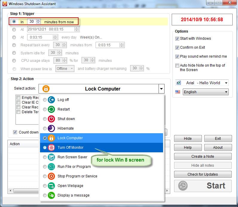 Windows Shutdown Assistant by Apowersoft is a well-rounded and complete Windows automation tools out there. It lets you shutdown, log off, hibernate, restart and, of course, lock your PC after a certain delay that you can specify. All that required is to select “Action” as “Lock” and specify the time event after which you want the action to occur. Basically, you will be closing all unauthorized access to your computer – only those with whom you have shared your account password will be able to access the computer and its contents. Alternatively, you can choose to simply turn off your monitor, while keeping everything running under the hood, by choosing the “Turn off Monitor” action instead.