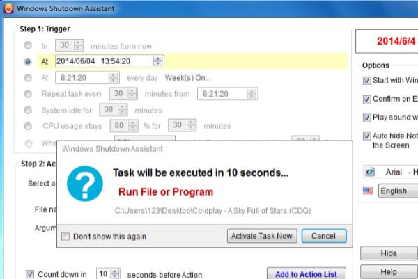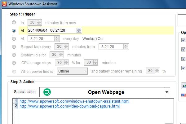Windows Shutdown Assistant enables you to turn off Windows automatically in various modes. You are allowed to set the time to turn off the computer. Or, just configure settings to let computer shutdown when it's power off, over heat, or idle over a period of time. It only requires two steps to do so - set the "Trigger" and "Events", then let the program do the rest for you.
